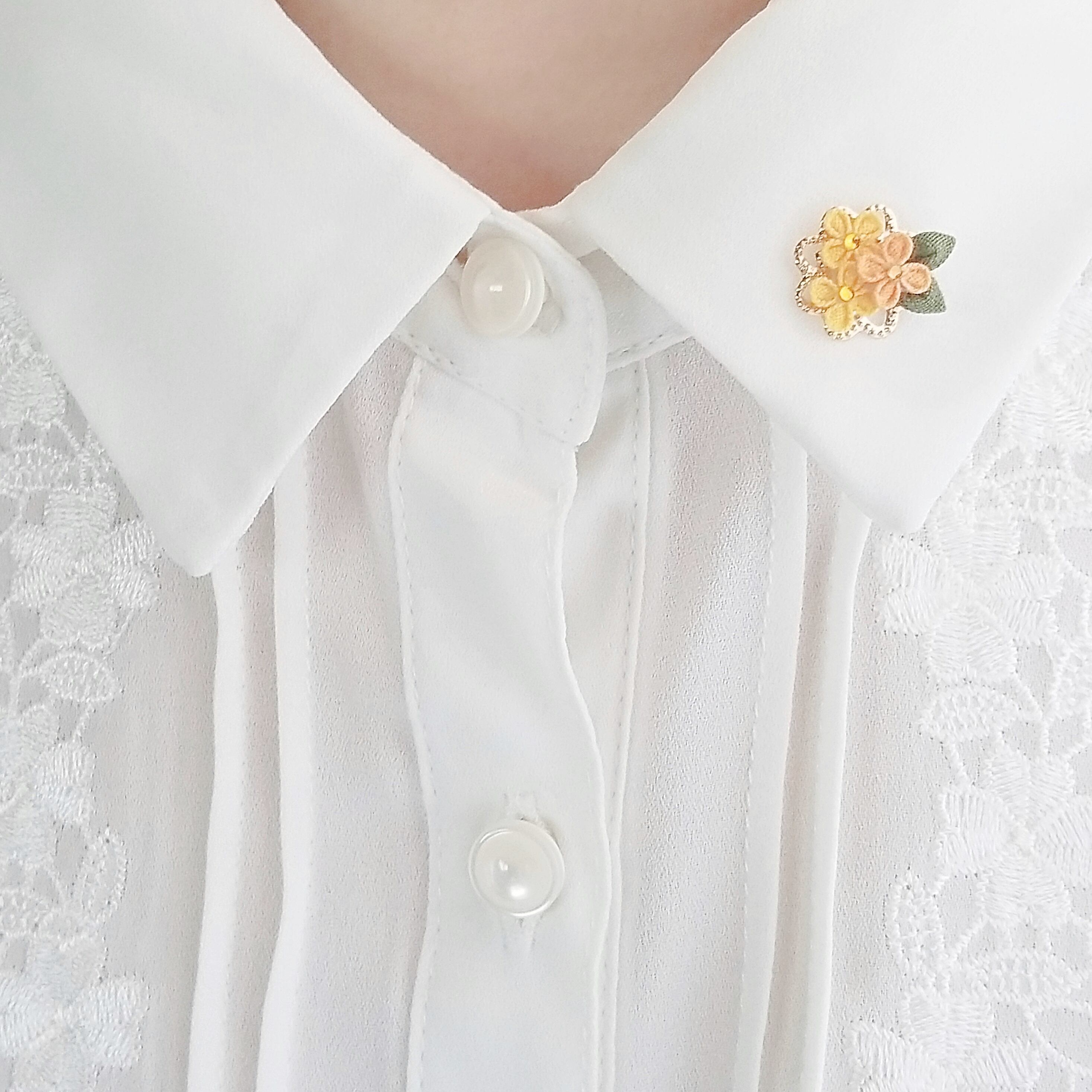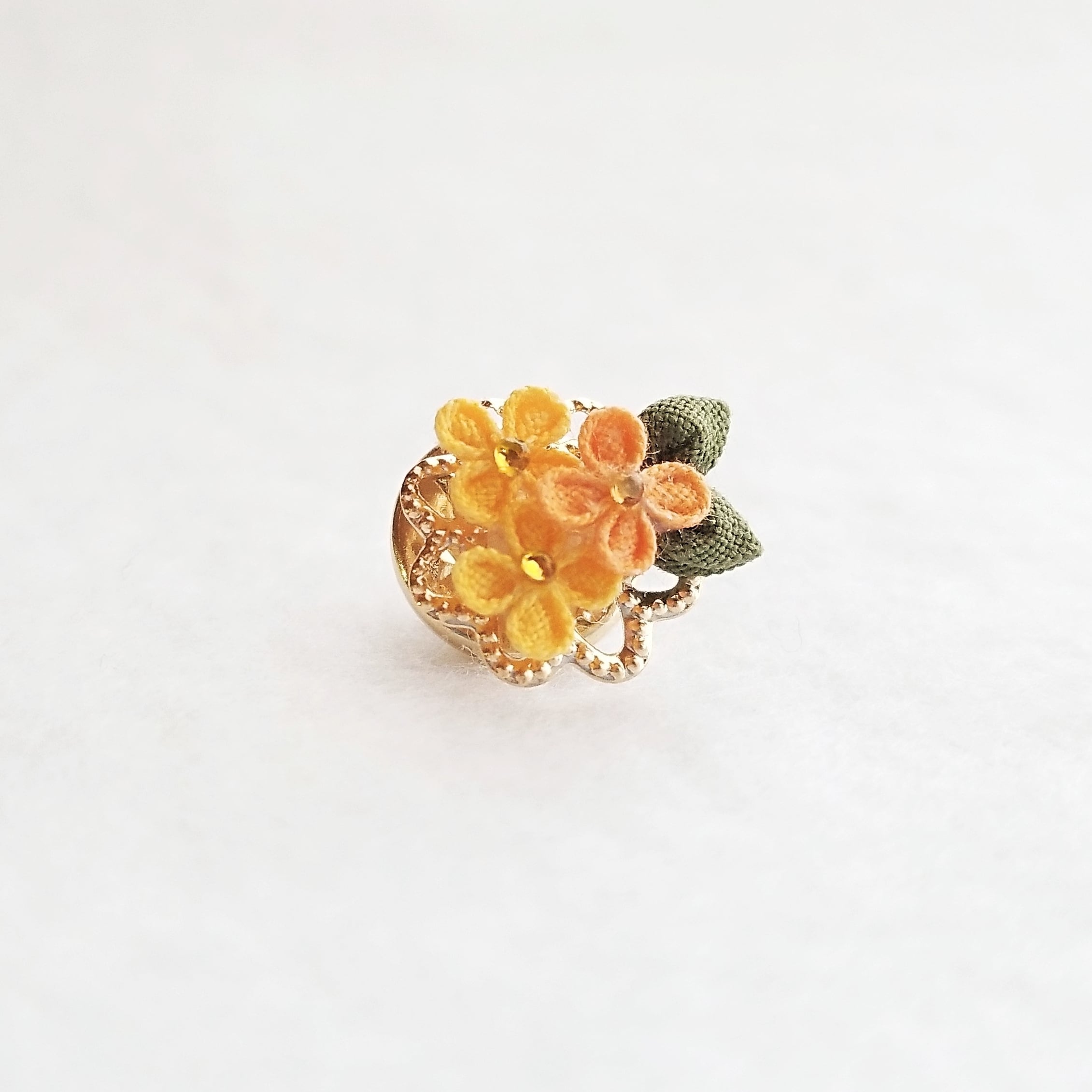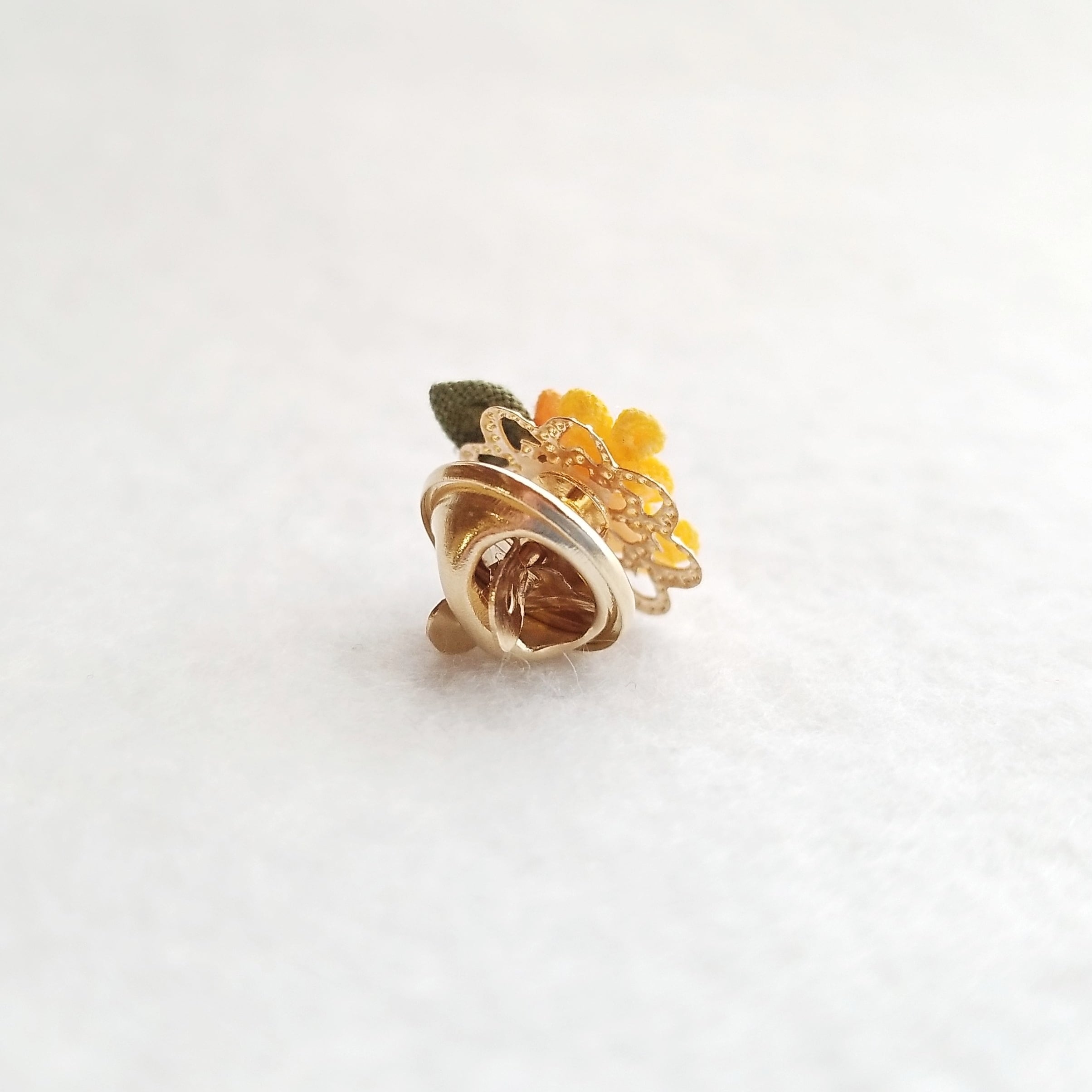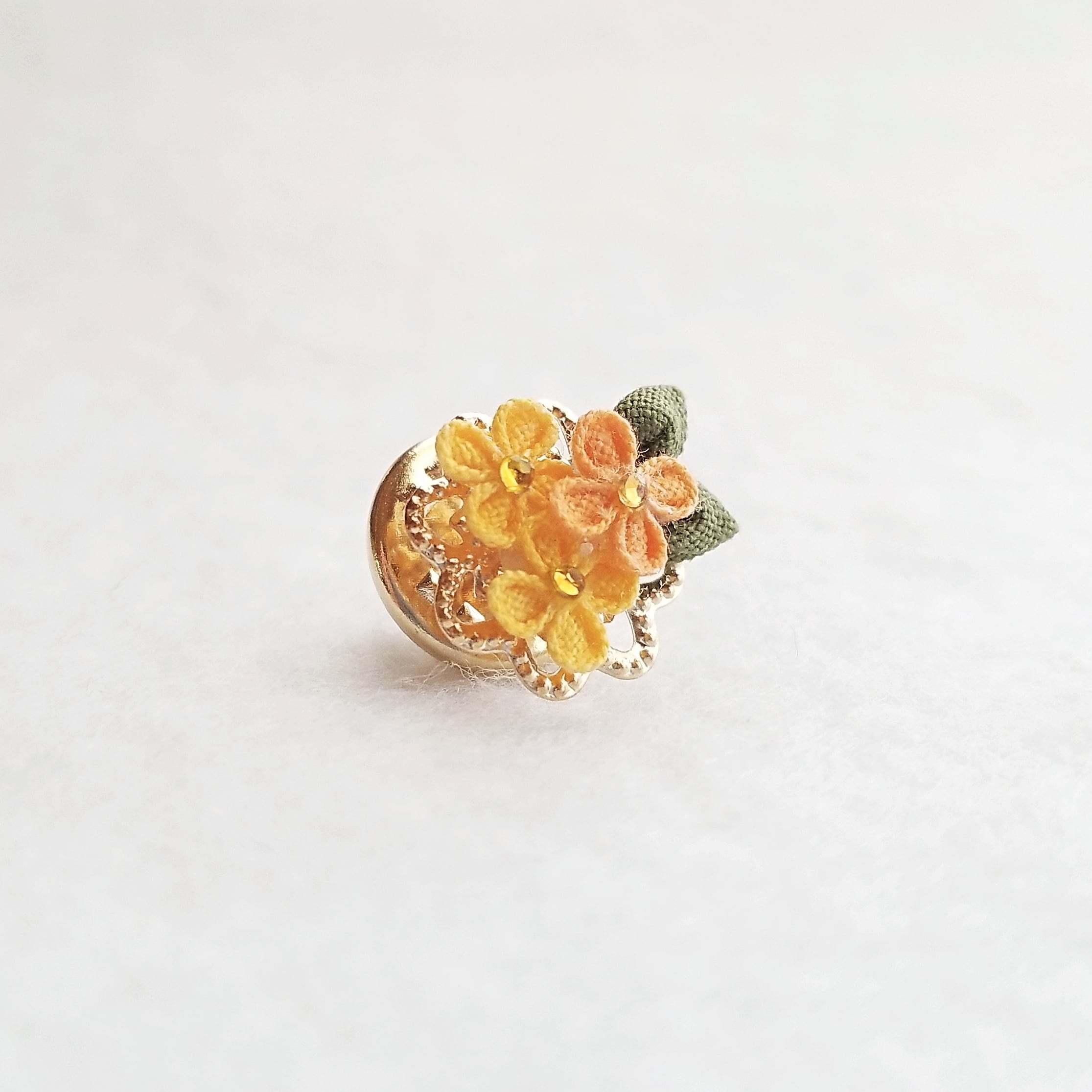 Tsumami zaiku/Tsumami craft/Japanese traditional craft/つまみ細工/花/和/和風/洋/洋風/卒業式/成人式/結婚式/ウエディング/記念日/誕生日/クリスマス/バレンタイン/春/夏/秋/冬/フラワー/ギフト/プレゼント/贈りもの/贈り物/クリスマスプレゼント/クリスマスギフト/大人可愛い/綺麗/イエロー/きいろ/黄色/オレンジ/橙/みかん色/きんもくせい/キンモクセイ/秋/フラワー/蝶タック/タイタック/ラペルピン/ピンブローチ/ピンバッチ/ピンバッジ/ピンズ/襟ブローチ/マスクチャーム/マスクアクセサリー/マスクピアス